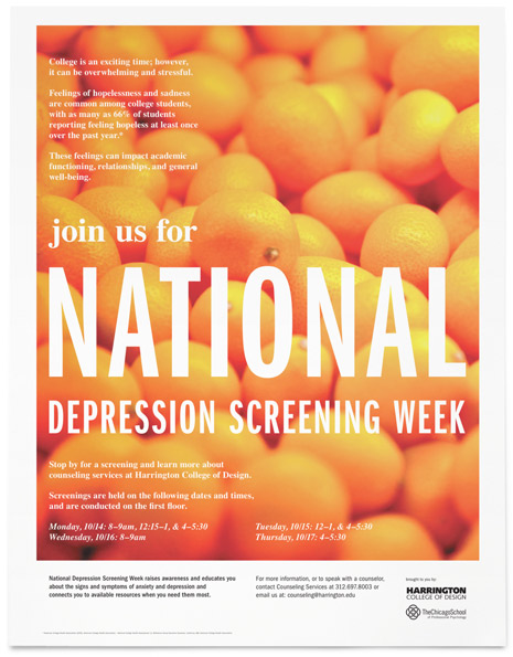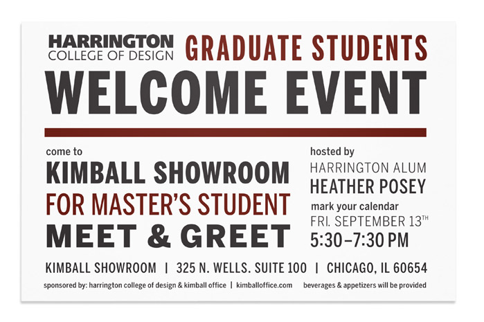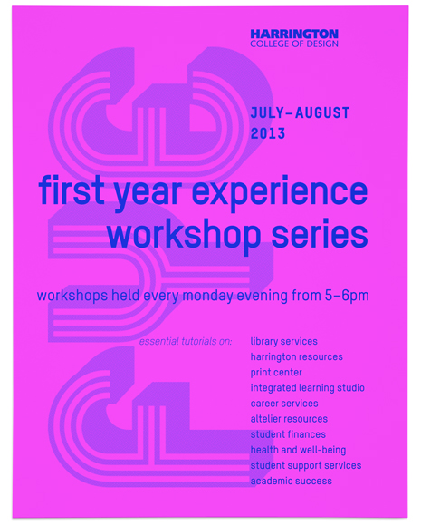 Selected fliers and medium sized posters for Harrington College of Design counseling and academics departments.